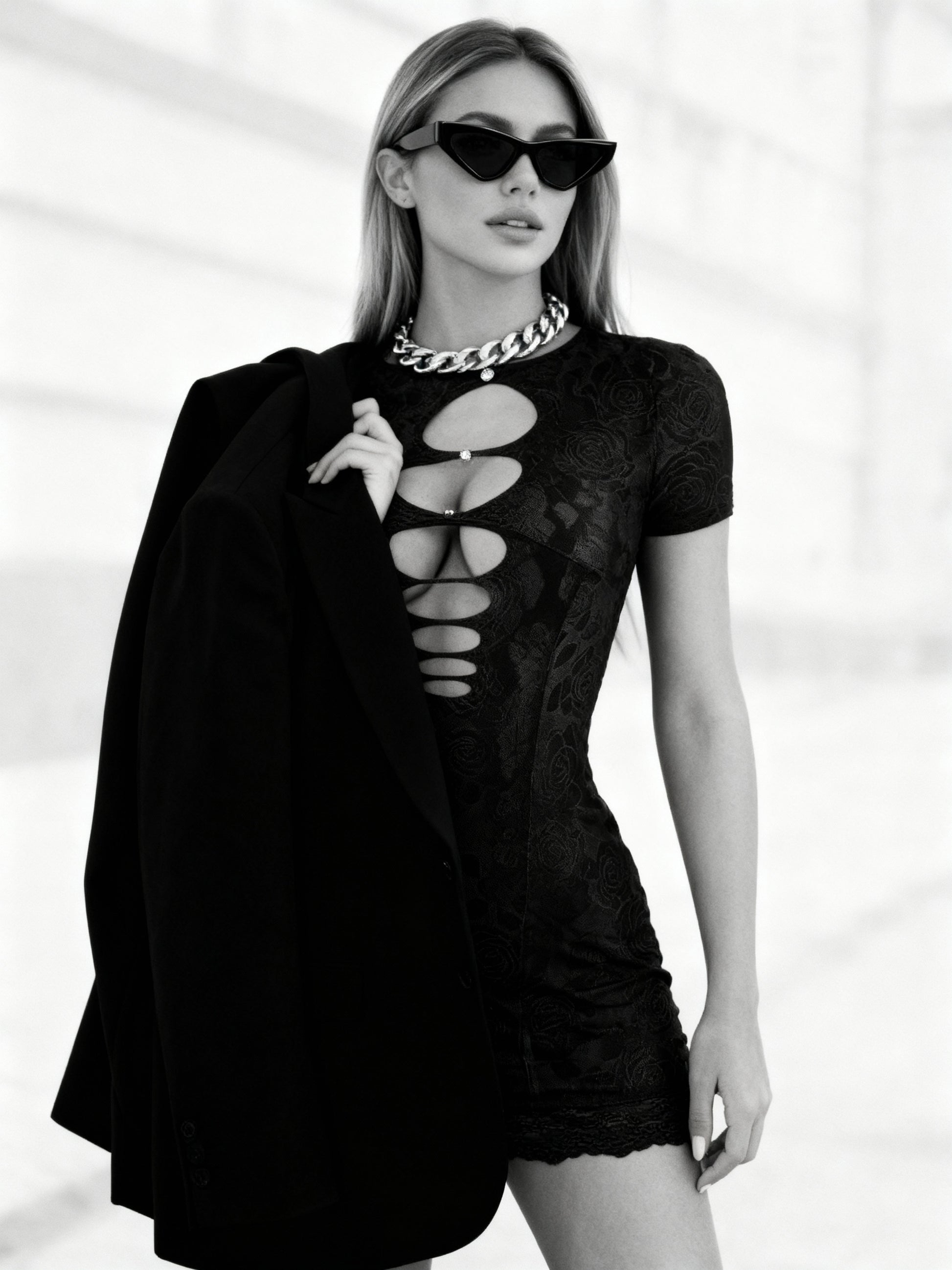 Черна рокля с изрязани участъци отпред, с декоративни камъчета. Къс ръкав, без подплата. Леко разтеглива материя.